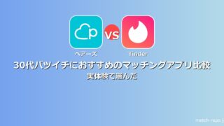 30代バツイチにおすすめのマッチングアプリをペアーズとTinderで実体験比較。8ヶ月120マッチvs6ヶ月85マッチの結果と口コミから選び方を解説。真剣度とコスパで決める最適アプリ。